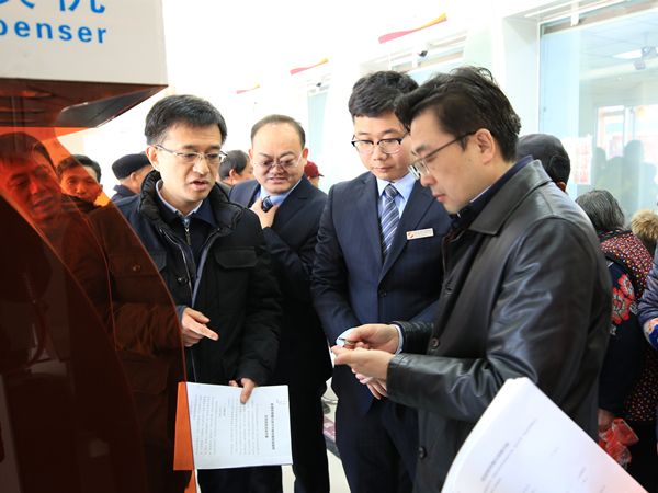 贾拓副行长走进网点听取工作人员介绍我行打造现金服务示范网点的特色做法,观看了硬币兑换机、残损币兑换仪等机具的操作演示,并与在营业厅内等待存取现金的农民亲切交流,了解农村地区现金使用需求等情况。